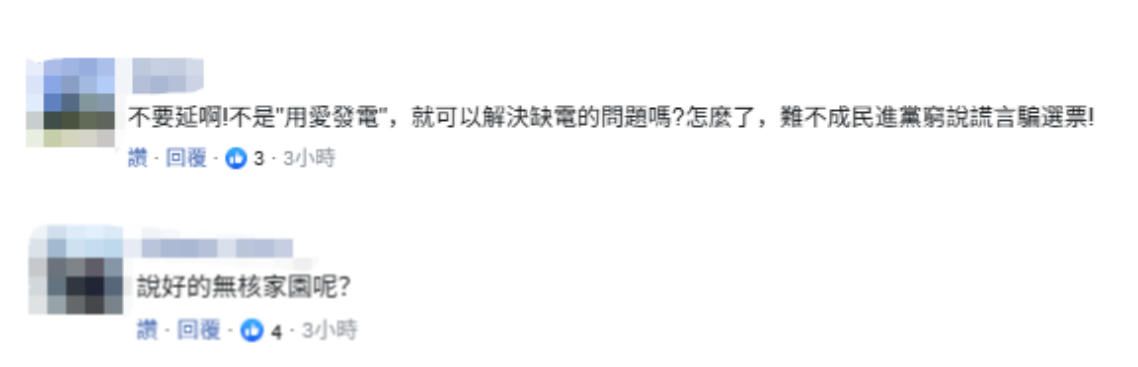 对于龚明鑫有关说法,有岛内网民讽刺称,“不要延啊!不是‘用爱发电’就可以解决缺电的问题吗?怎么了,难不成民进党说谎言骗选票!”“说好的无核家园呢?”